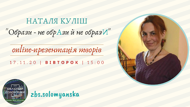 17 листопада 2020 о 15.00 Публічні бібліотеки Солом'янки завпрошують на онлайн-презентацію творів журналістки Наталі Куліш "Образи - не обрАзи й не образИ" як відповідь на питання: "Про що і навіщо пишуть журналісти?"
